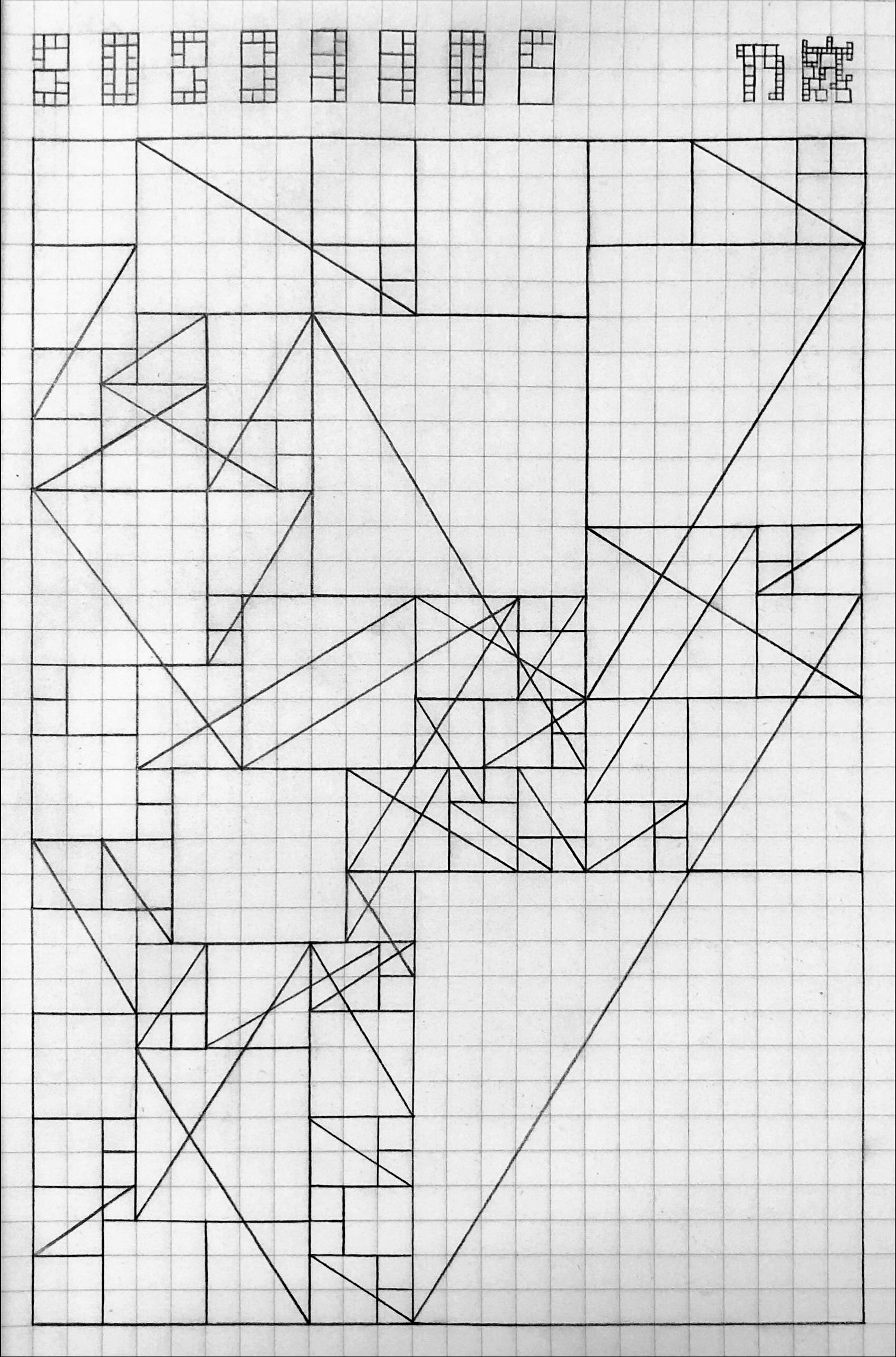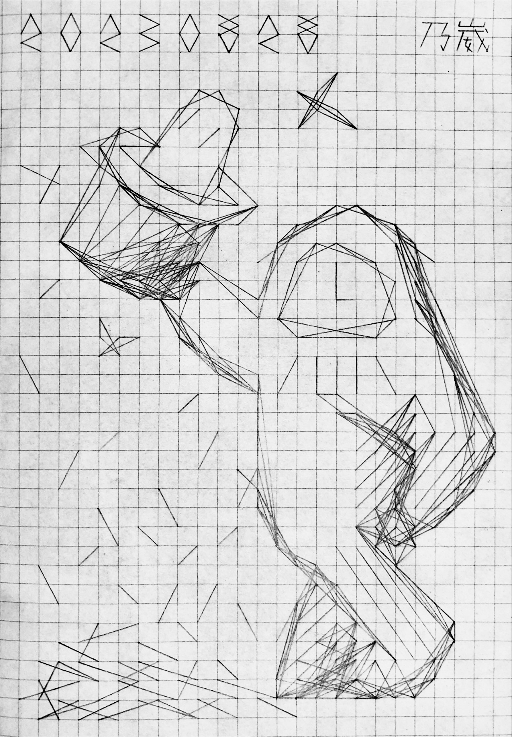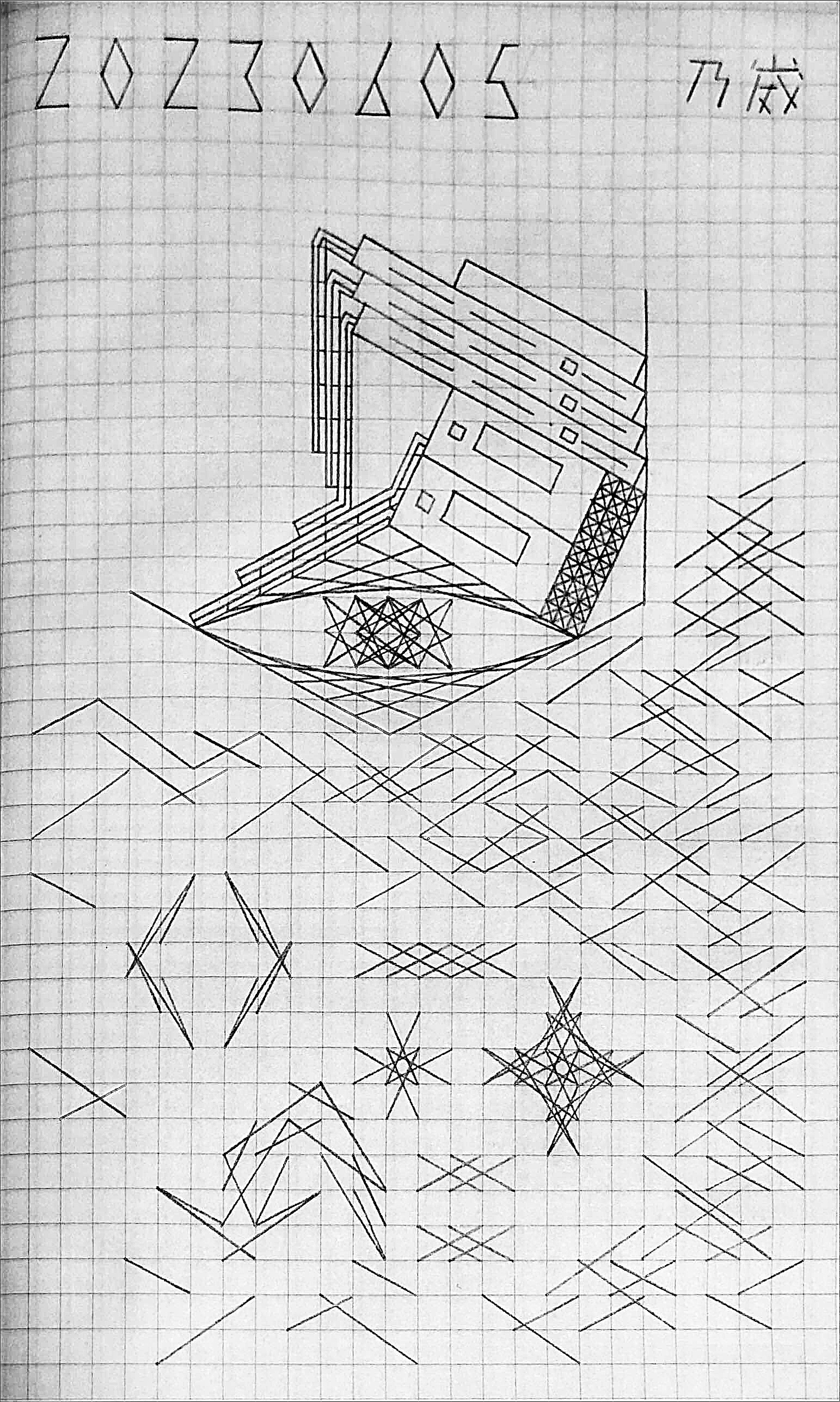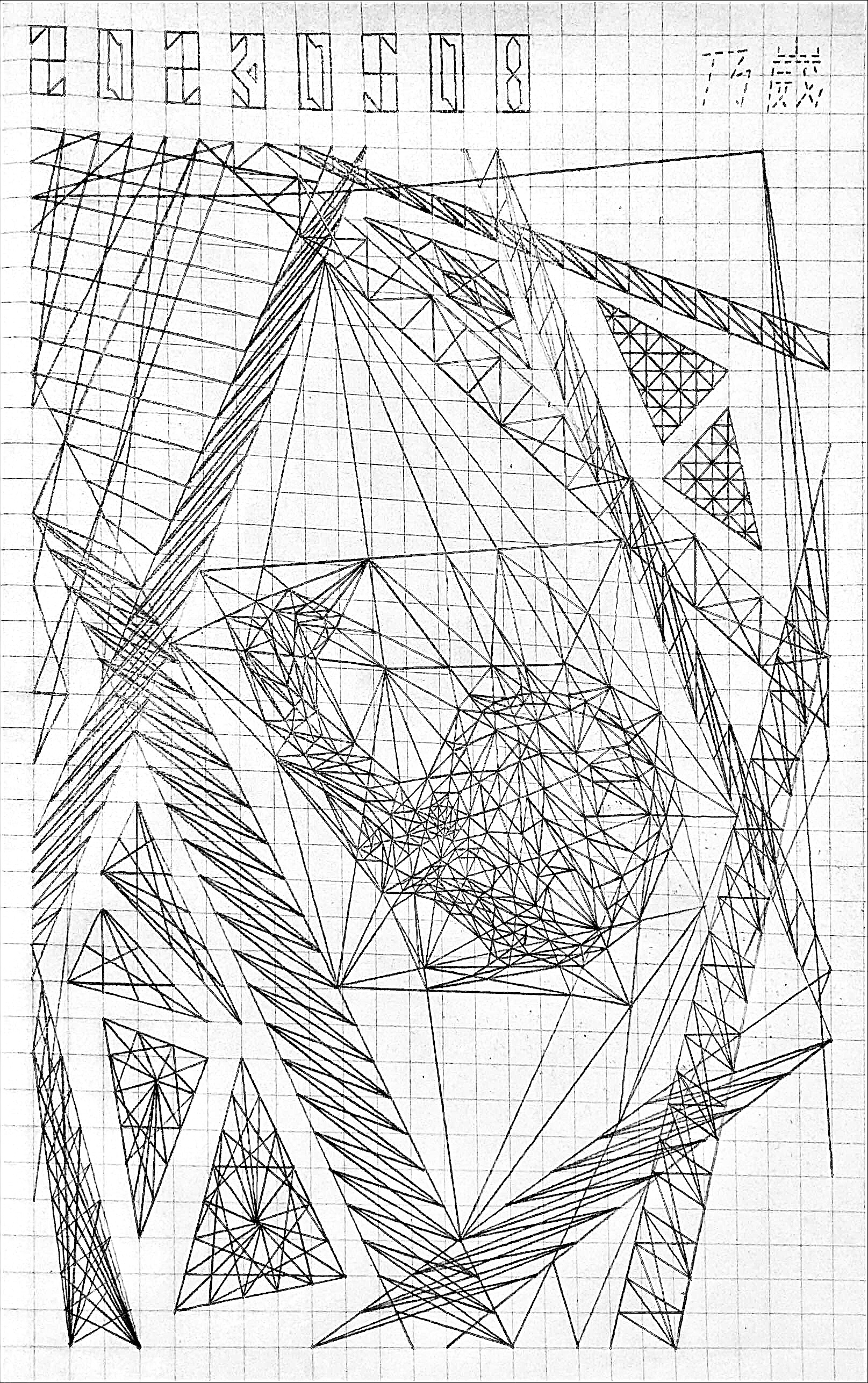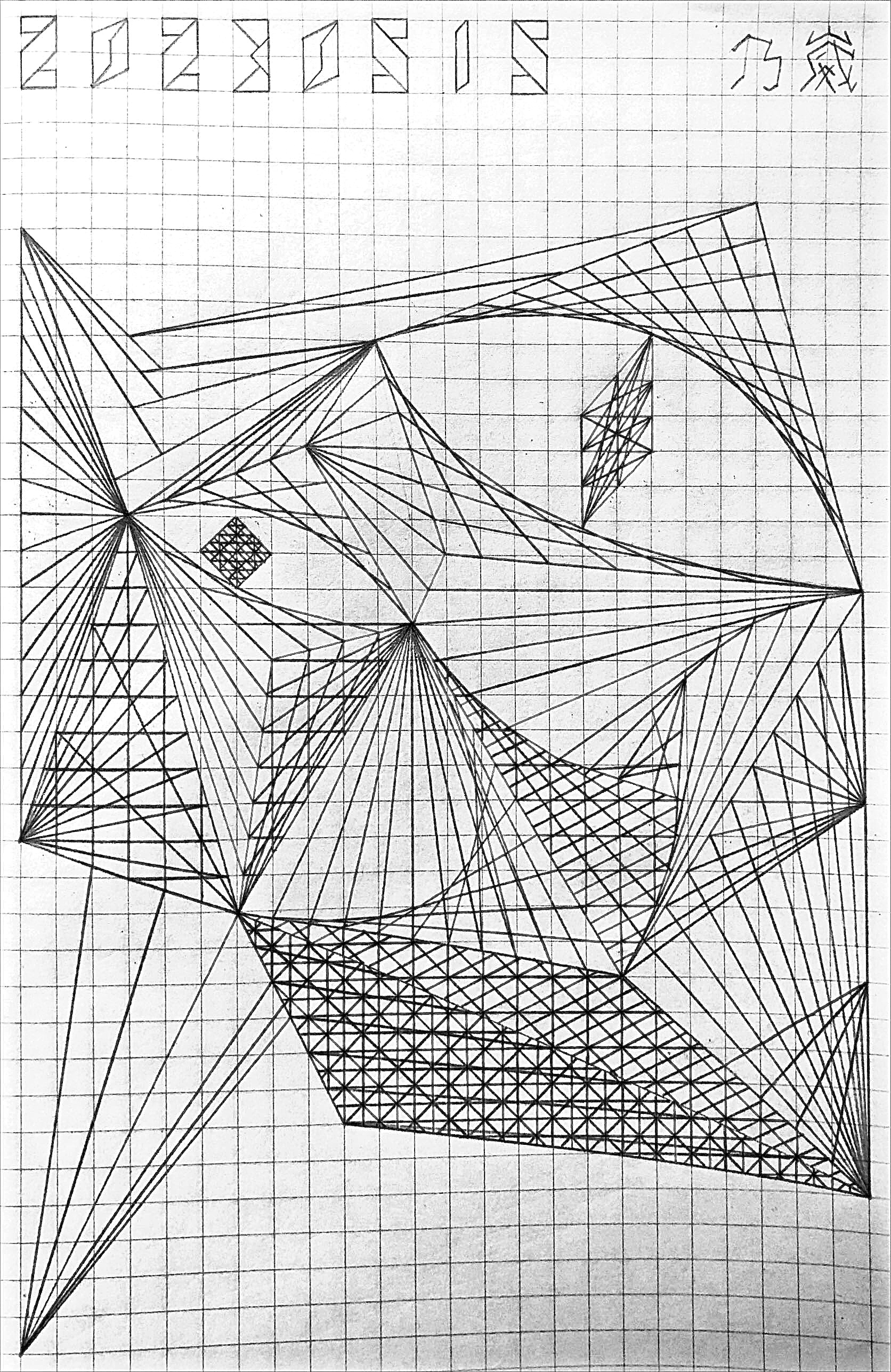 以純線條為限制條件,一週完成一幅素描,最終累積一百週的持續創作。作品以 2B 鉛筆於 A5 方格紙上繪製,探索直線取線在構圖、明暗與空間上的可能性。