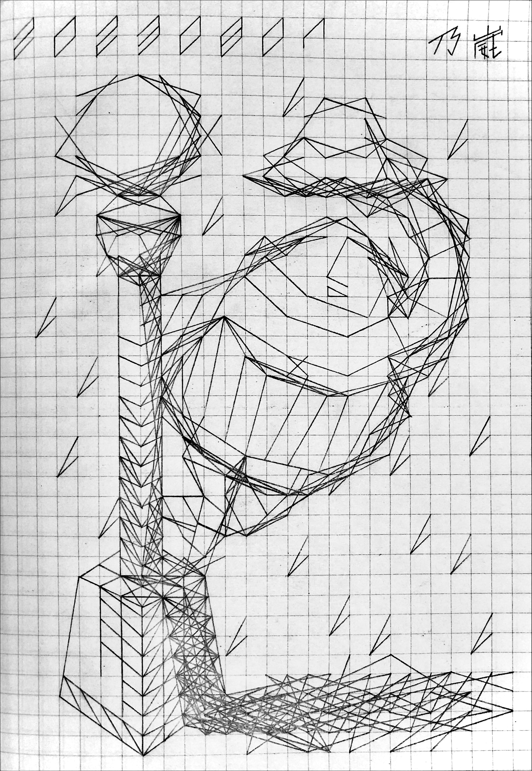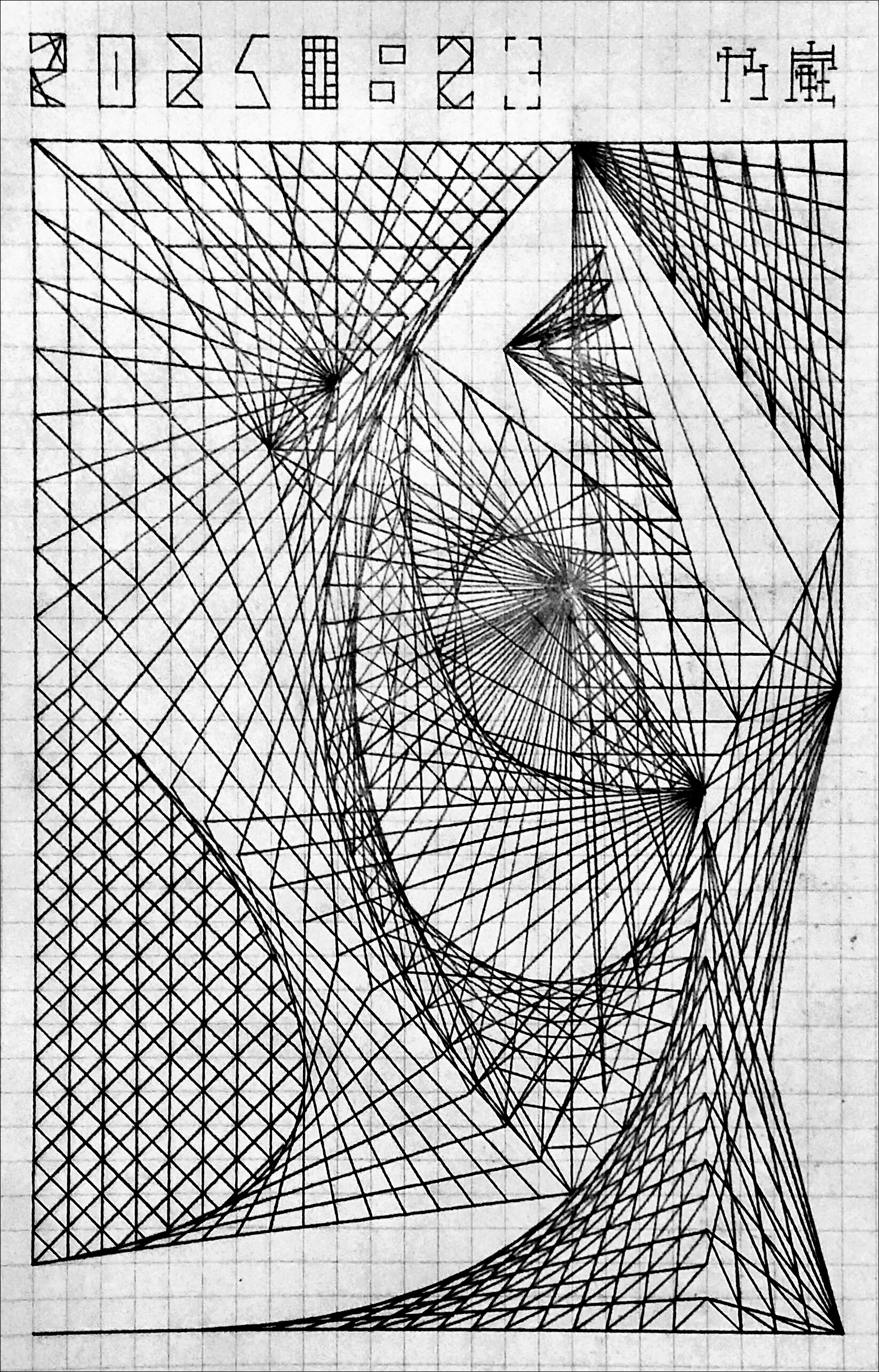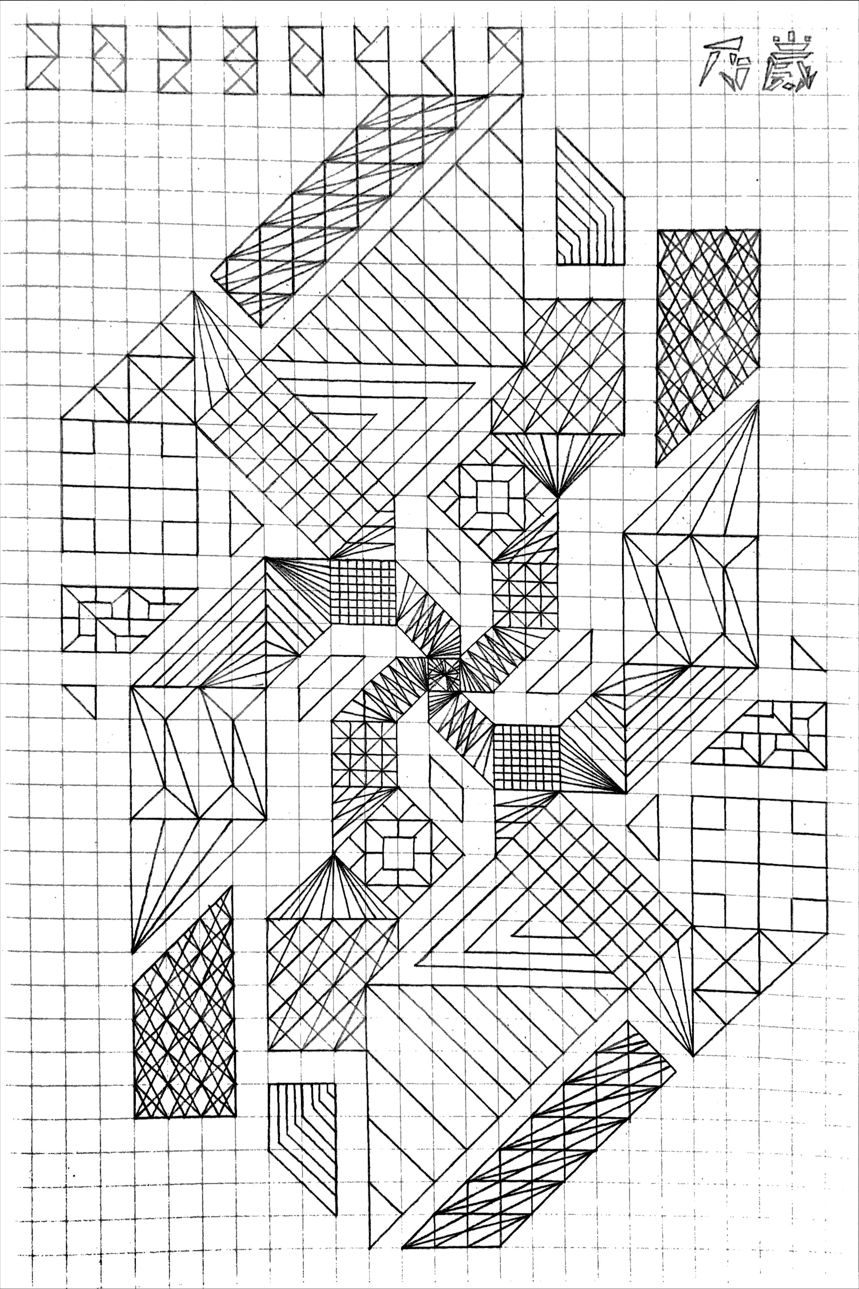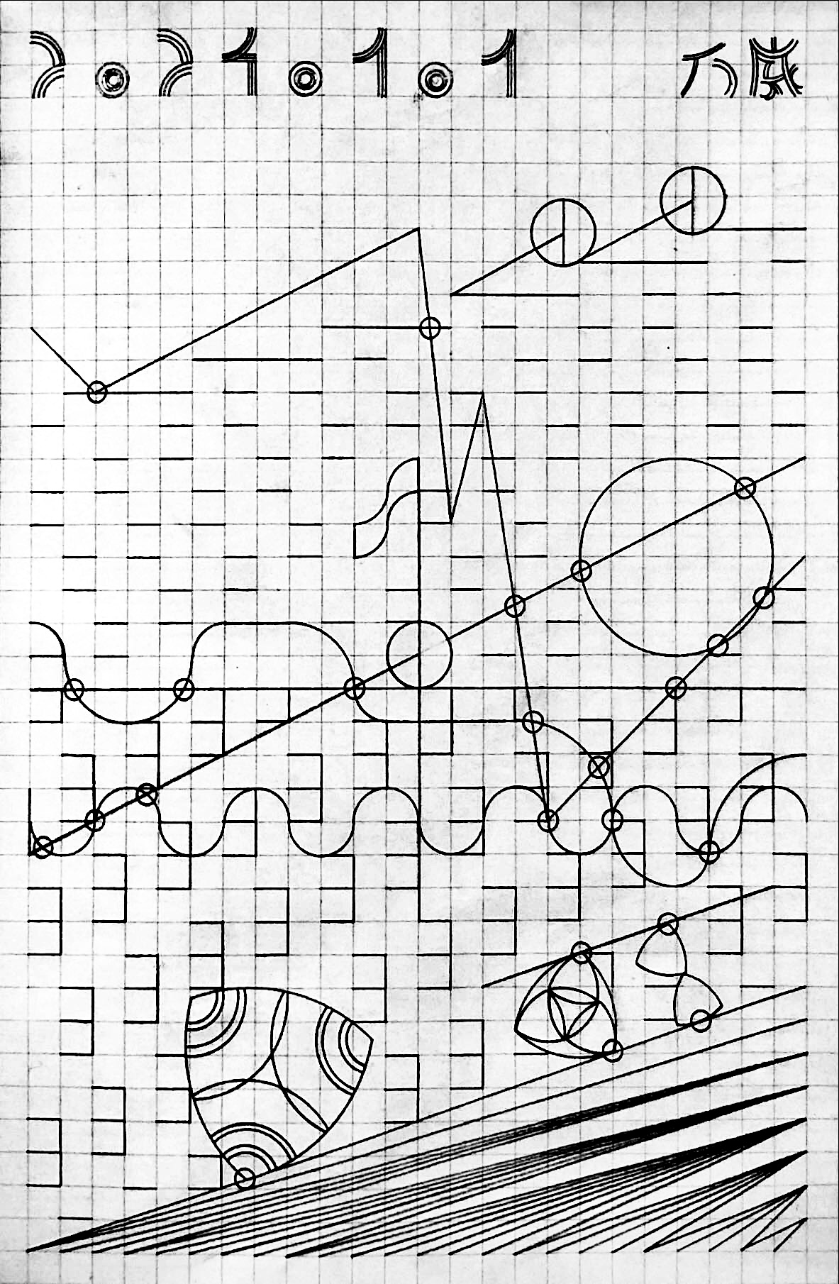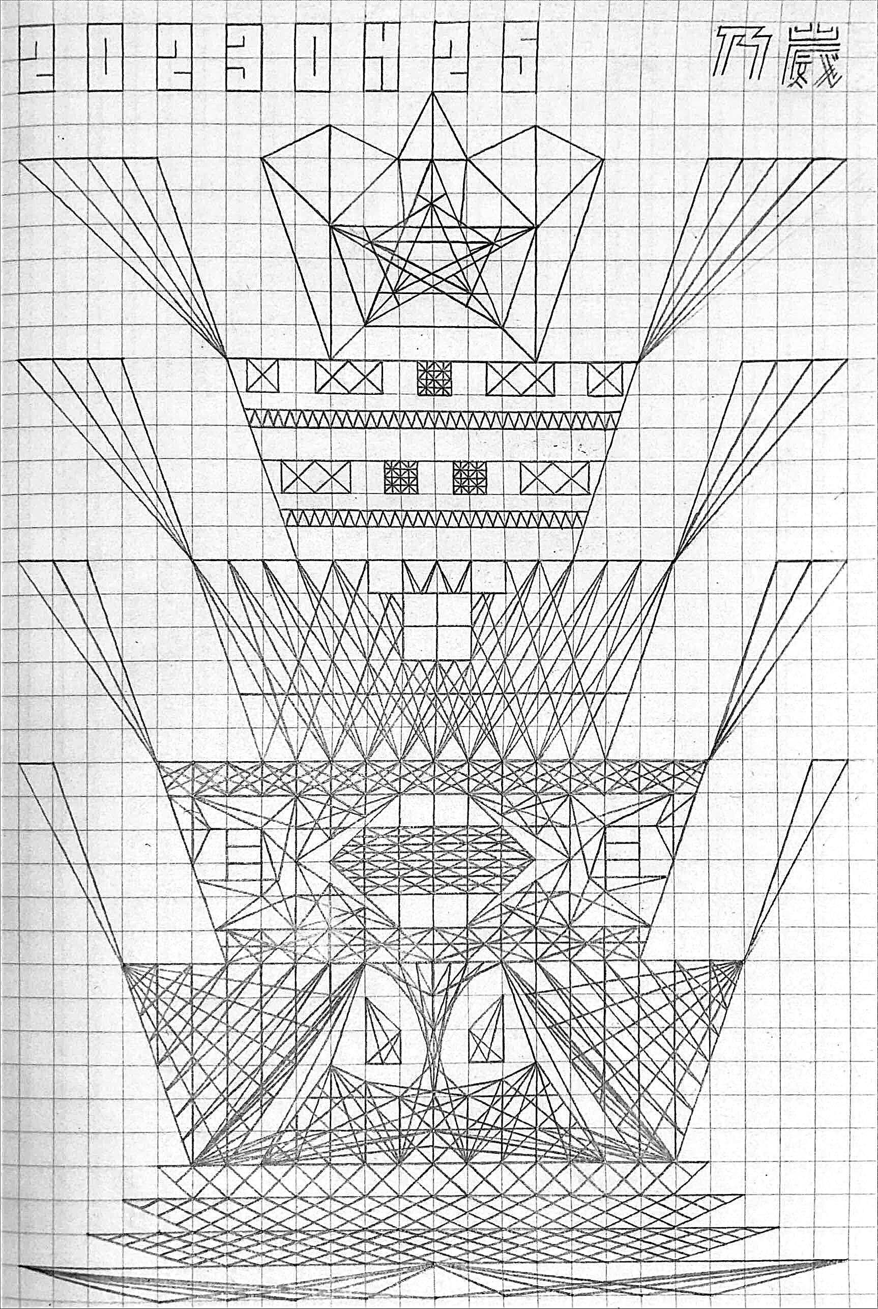 以純線條為限制條件,一週完成一幅素描,最終累積一百週的持續創作。作品以 2B 鉛筆於 A5 方格紙上繪製,探索直線取線在構圖、明暗與空間上的可能性。